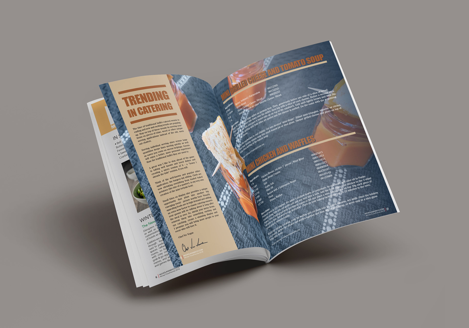 FoodTrends Magazine is an in house created magazine sent out to Nicholas and Company's supplied Chefs to help them stay up on the trends and learn new things to help their business grow. I had the opportunity to bring the vibrant world of food to life through captivating visuals and elegant design. Designing the magazine involved curating stunning food photography, crafting engaging layouts, and finding the perfect balance between aesthetics and functionality. From selecting typography that complements the culinary theme to creating visually enticing spreads that showcase recipes, techniques, and chef profiles, I aimed to create an immersive and visually appealing reading experience.